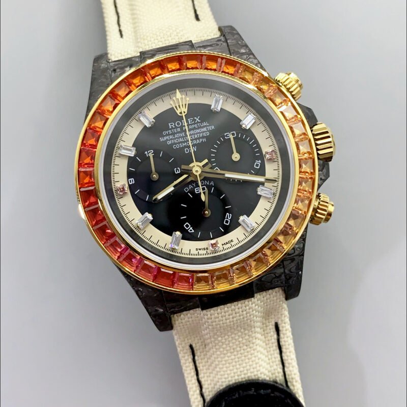 Rolex Daytona DiW Carbon Edition Rainbow Bezel – Forged Carbon Casing Beige Strap(1:1Super Clone )