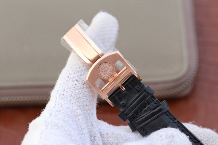 黑色真皮表带,搭配精钢表扣,镌刻IWC标志及铭文。