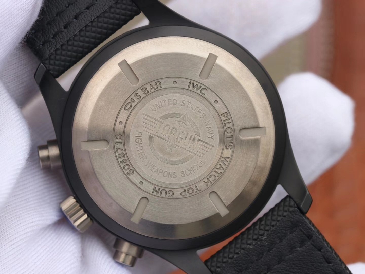 IWC Pilot Series TOP GUN Naval Air Warfare Force MIRAMAR timing watch. Glorious appearance of the watch size 44X16.5mm high-strength ceramic case is lighter and stronger than traditional fine steel. ZF perfectly restores the delicate luster and soft texture of the genuine case. grasping the details. extreme re-engraving. The original IWC89361 movement was modified based on the powerful Dandong movement. The diameter and thickness are the same. to achieve all the functions of the genuine movement. 6-point small second hand with a stop device. 12 o'clock position in the reading mode to show the cumulative hour precision minute timing. The commissioning technique is also synchronized with the original. Strap buckle: using the U.S. military composite fiber braided strap. waterproof breathable. comfortable and durable. with IWC titanium folding buckle.