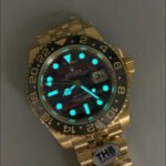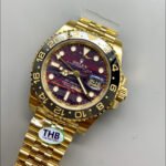 The new Rolex Greenwich GMT-Master Tiger’s Eye watch features a dial made of natural tiger’s eye stone, consistent with the materials used in the genuine product.