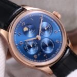 葡萄牙系列 IW5034.01 百万年历腕表,首款真正意义上的永久年历腕表。以进口大精工机芯为基础,升级为 52610 机芯,不仅实现了大部分功能,而且走时稳定,故障率极低。这是一款在重刻市场中难得一见的复杂功能腕表。主要优势:1. 万年历八点位运行正常(2017-2024 年,2024 年可免费返厂更换年份模块)。与原装表款一样,可通过表壳隐藏按钮进行调整,且优于原装表款的可逆式设计(原装表款年份不可逆,调整后维修费用自理);2. 日月星辰(年历)、日期(3 点钟位置)、月份(6 点钟位置)、星期(9 点钟位置)均运行正常。并且可以手动调节(日期通过拉出二档进行双向调节,月份通过8点隐藏按钮调节,星期可以通过调节指针调节);3. 做工精湛——内外兼修。采用德国CNC设备开模表壳表带,后期经人工逐一质检。表壳各处的磨损和翻转几乎与原装无异。机芯文字字体分布与原装同步。鱼鳞纹等图案打磨细节非常精致。弧形防刮镜面与原装一样通透。4. 手感优雅——尺寸41 x 13