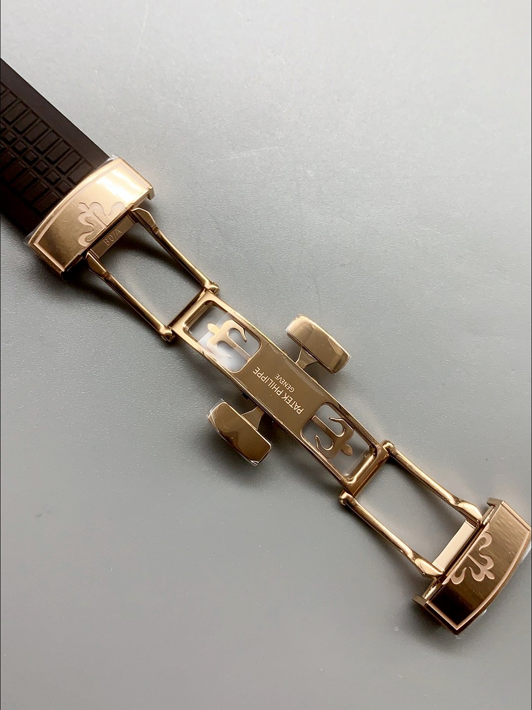 Brown New Style Curved Rubber Strap with Steel Folding Clasp complete with Patek Philippe Markings.