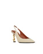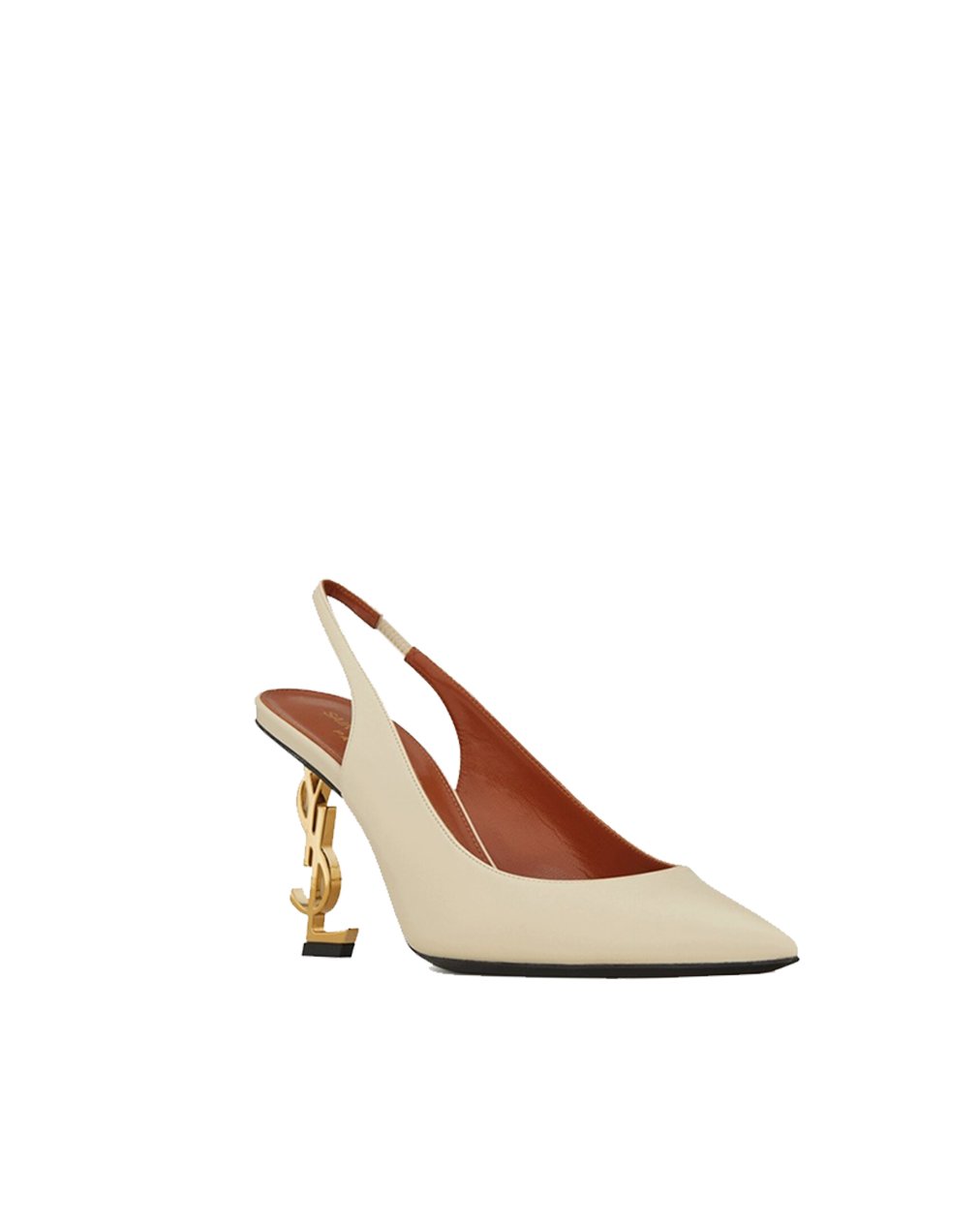 Saint Laurent Gold Metal Heel Slingback Pumps with Pointed Toe, crafted from premium cow leather and featuring a sleek leather sole. These pumps boast a total heel height of 8.5cm, providing the perfect balance of elegance and comfort. The shallow design, pointed toe, and elastic slingback straps offer a modern twist, while the sculpted heel adorned with metallic YSL lettering adds a touch of sophistication. Elevate your style with these versatile pumps, perfect for both formal occasions and everyday wear.